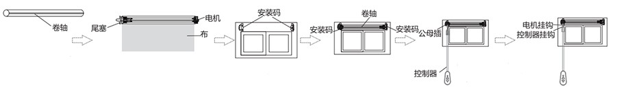1. 準(zhǔn)備Φ40mm卷軸, 長(zhǎng)度=總長(zhǎng)-25mm,卷軸內(nèi)外邊緣毛刺清理干凈, 確保卷軸內(nèi)壁清潔。2. 將尾塞、布、電機(jī)裝入卷軸內(nèi)。3. 將安裝碼固定于墻上。4. 把卷軸裝入安裝碼上。5. 將M2504EB控制器與M2504EB電機(jī)的對(duì)接口的公母插對(duì)接。6. 將M2504EB控制器掛鉤掛入M2504EB電機(jī)掛鉤內(nèi)。