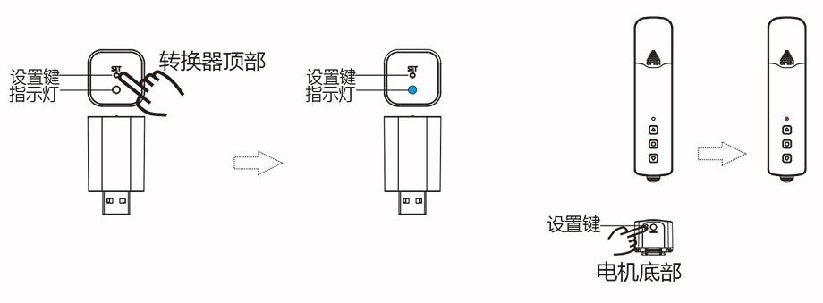 ◆點按轉(zhuǎn)換器【設置鍵】,當轉(zhuǎn)換器【指示燈】藍色快閃后,連續(xù)點按電機【設置鍵】兩次,電機【指示燈】紅色慢閃;