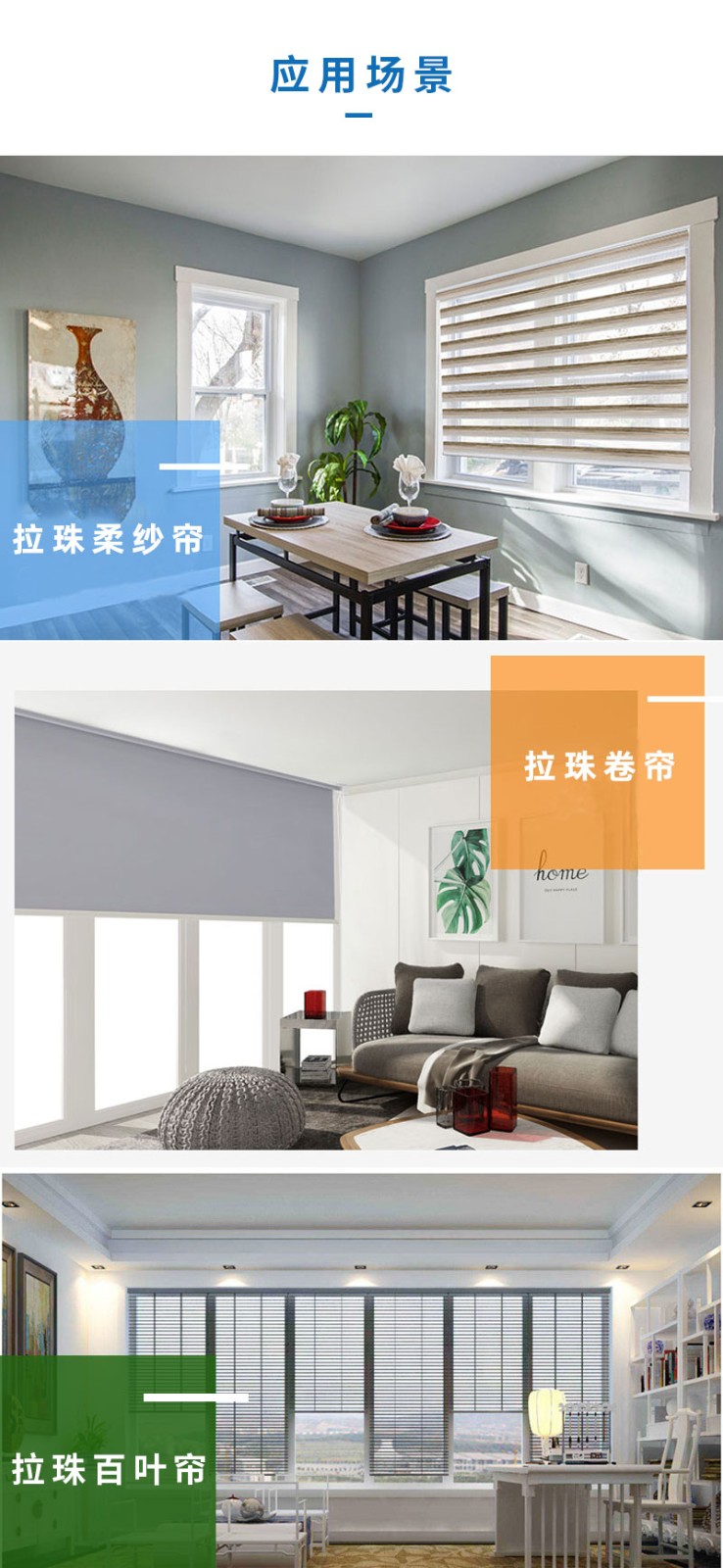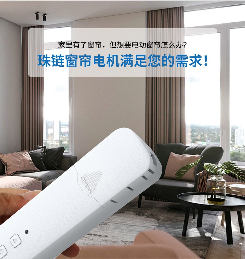 此產(chǎn)品適用于拉珠卷簾,可以把傳統(tǒng)的拉珠卷簾改變?yōu)橹悄茈妱?dòng)窗簾,安裝簡(jiǎn)單,操作方便。安裝后可通過(guò)遙控器、語(yǔ)音、手機(jī)APP等控制窗簾升降。